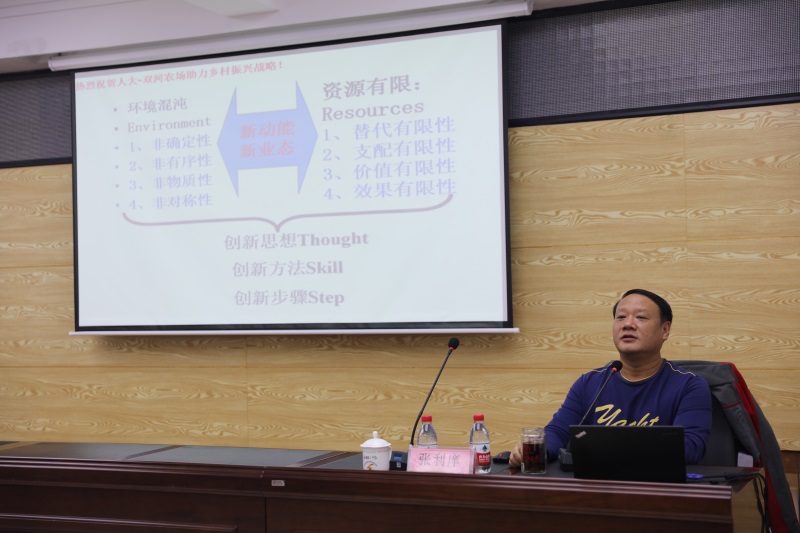 19日下午,张利庠教授为农场中层领导干部作了题为《中国人民大学—双河农场助力乡村振兴工程启动会暨专题报告会》的专题报告,用风趣幽默的演讲将乡村振兴战略最新精神和基本内容通俗易懂的进行了讲解,并结合首农食品集团党委书记、董事长王国丰到双河调研时的讲话精神为农场的发展战略提供了宝贵意见。