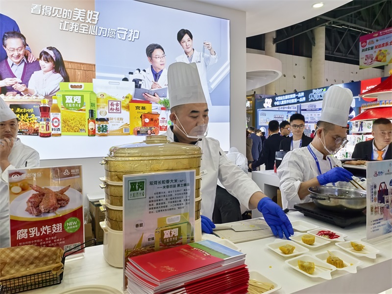 在本届糖酒会上,双河农场携米、面、油、杂粮、甜糯玉米、酸菜等全系列农产品集中亮相。展区内,现场制作的各式美食香气四溢,吸引众多与会客商与消费者驻足品鉴、咨询洽谈,展位人气持续走高,产品获得一致好评。为进一步拓宽营销渠道,双河农场今年创新采用“线上+线下”联动模式,依托“双河粮行”抖音平台在展会现场同步开启直播。直播过程中,工作人员围绕产品安全、品质保障及全产业链优势等内容进行细致讲解,将来自黑土地的优质农产品从展台延伸至屏幕,实现品牌展示与销售转化的高效融合。展会期间,线上直播间最高同时在线人数接近200人,累计曝光量超过2万人次,直播带动新增粉丝101人,线上销售表现持续向好,为推动优质农产品走向更广阔市场奠定坚实基础。