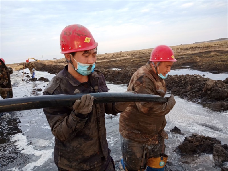 在铺设电缆施工中,受日前暴雪影响,使此次铺设难度增大,800余米的电缆铺设线路均是在雪地淤泥中进行,且搬运和铺设电缆距离长、截面大,路径弯道多、直行距离短,无法使用机械力量,需要员工们一点一点人工铺设。铺设中,工作人员需下到冰冷的水沟里进行铺设,爬上爬下体力消耗非常大,一会儿功夫,每个人的脸上都露出豆大的汗珠,浑身都是泥水,汗水湿透了衣背。