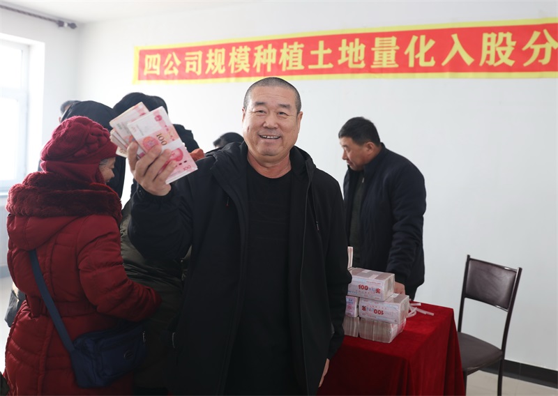 “我们最开始是采用了入股经营的方式开展适度规模经营,用职工自己的土地进行入股,由牵头人托管经营,年底保底按股进行分红。去年我们又率先尝试了两田剥离的措施推进适度规模经营,让更多想开展适度规模经营的职工都能参与其中,通过适度规模降低生产成本,去年每名职工每亩分红700元,玉米较常规个人种植每亩增收350元,大豆较常规个人种植每亩增收60元左右,入股的土地较流转土地每亩增收近300元。”农场率先开展适度规模经营的农业经营四公司经理张景军真正成为了带领职工致富的引路人。农场通过农业经营四公司试点先行,使适度规模经营在各旱作农业经营公司得到推广,先后提出土地量化入股、腾退土地滚动集并、生活田承租权一次性回购等措施,推进适度规模经营。四年来累计推广适度规模经营10.5万亩,大规模、集约化的作业方式,不仅促进了土地的可持续发展,更让职工种植户得到了真正的实惠。