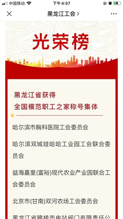 近年来,农场工会在黑龙江省总工会、齐齐哈尔市总工会及集团工会的指导关怀下,在农场党委的高度重视和大力支持下,以习近平新时代中国特色社会主义思想为指导,紧紧围绕农场中心工作,全面加强职工之家建设, 2019年农场工会被齐齐哈尔市总工会授予了“模范职工之家”荣誉称号,被黑龙江省总工会授予了省级“模范职工之家”荣誉称号。