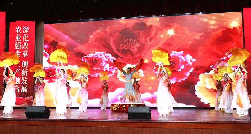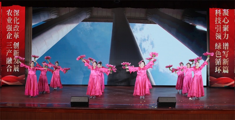 表彰大会上农场干职群众还结合自身工作实际,精心编排了一系列精彩感人的演出节目,农场青年女员工编排的舞蹈《盛世欢歌》、音乐快板《工会是咱温馨的家》、情景剧《致富路上》、黑六牧业公司自编情景剧《为梦坚守》、双兴农科公司编排的情景音乐剧《踏歌起舞庆丰收》、女生小合唱《我们的生活充满阳光》等节目赢得了大家的阵阵掌声。大会在优美的舞蹈和欢快歌声中圆满结束。