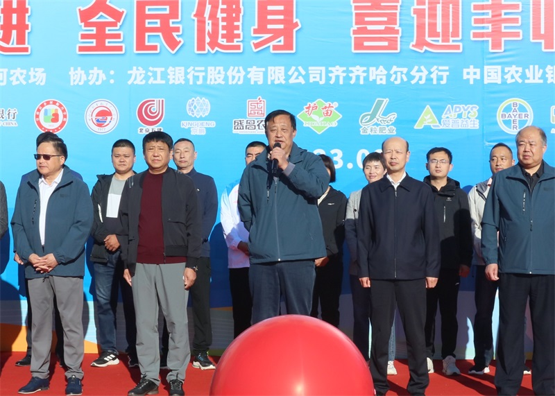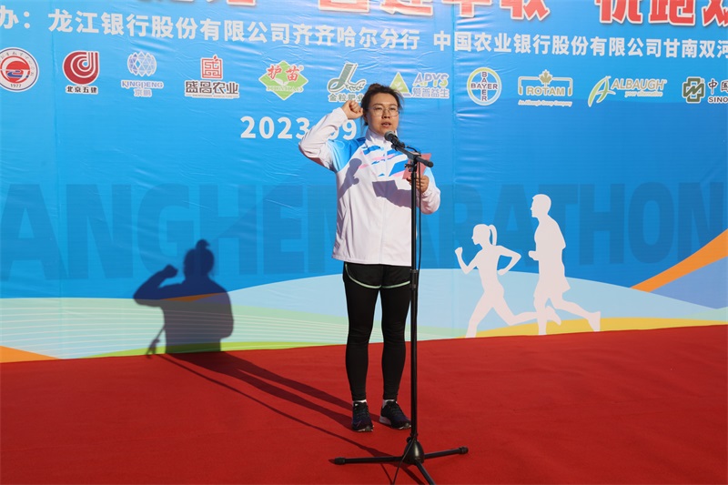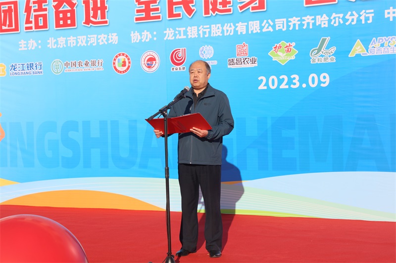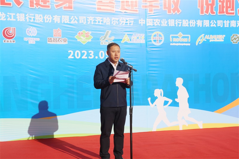 甘南县副县长唐守志在开幕式上致辞,并代表甘南县委、县政府对双河农场举办第六届“双河杯”半程(迷你)马拉松赛暨健步走活动表示热烈祝贺。他讲到,多年来,甘南县与双河农场坚持场县共建,始终把“三农”工作作为重中之重,取得了显著成绩。甘南县经开区双河产业园“七通一平”全面建成,首双食品酸菜预制菜项目建设已接近尾声,即将投产,县场合作取得了重要阶段性成果,标志着甘南县推动一二三产融合发展、延伸拓展产业链、实现产业提档升级迈出坚实一步。希望双方进一步强化共建合作,巩固提升共建成果,奋力谱写新时代“三农”高质量发展的绚丽篇章。