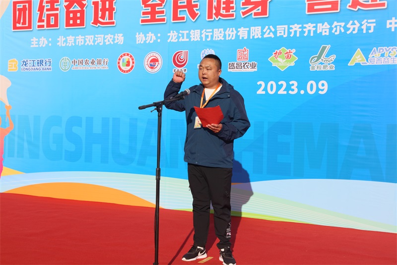 开幕式上,农场党委副书记、纪委书记、工会主席潘增瑞致开幕词。他讲到,值此金风送爽、景气怡人的美好时节,我们在此隆重集会,庆祝第六个“中国农民丰收节”,共同迎来双河农场第六届“双河杯”半程(迷你)马拉松赛暨“健步走”活动的隆重开幕。2023年是全面贯彻落实党的二十大精神的开局之年,也是“十四五”规划承上启下的关键之年,农场党委将坚决执行首农食品集团工作部署,奋力开创双河农场全面高质量发展新局面。同时希望全体参赛选手充分发扬“挑战自我、超越极限、坚忍不拔、永不放弃”的马拉松精神,赛出风格、赛出水平,以优异的成绩、良好的道德风尚,展现新时代双河农场干部职工敢于拼搏、奋发进取的精神风貌,也希望全体职工今后以更加昂扬的斗志,更加饱满的精神状态,奋力谱写农场全面高质量发展新篇章。