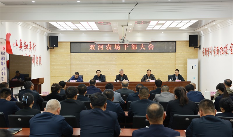 5月7日下午,双河农场召开干部大会。集团党委副书记、董事肖辉利出席会议并讲话。农场领导班子成员,机关部室正、副职和场属单位党政正职参加会议。会议由农场党委书记、场长丁守林主持。